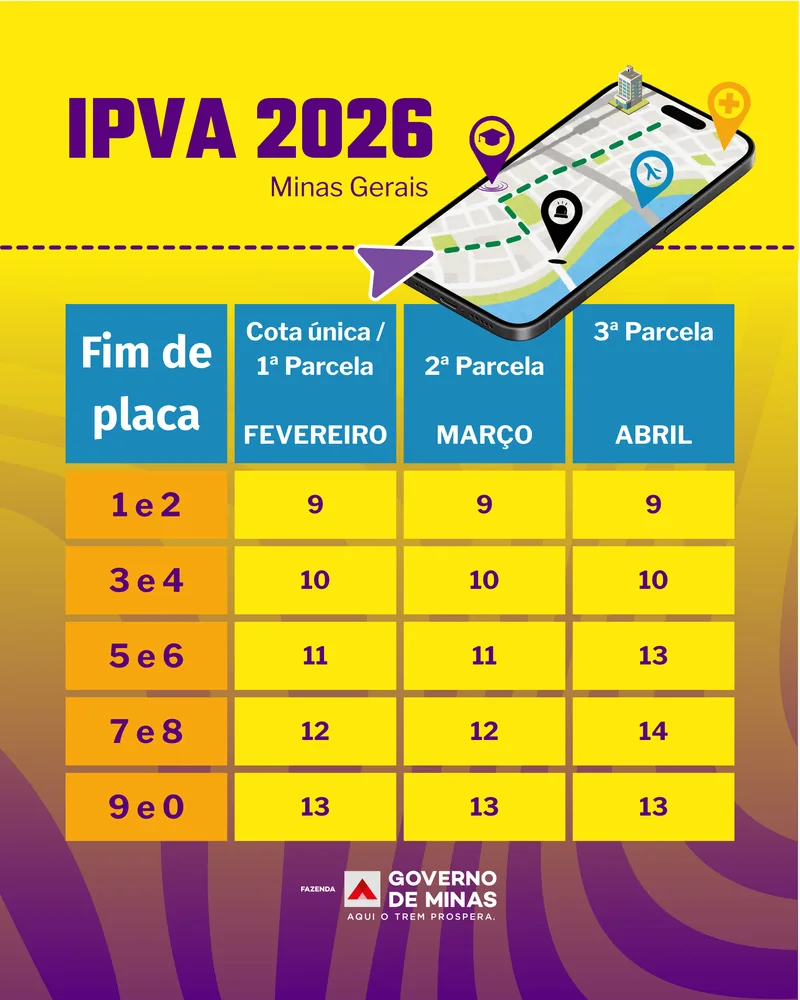A escala de pagamento do IPVA 2026 tem início em fevereiro, podendo o pagamento ser feito em cota única, com desconto de 3%, ou em três parcelas, sendo as subsequentes em março e abril. A Taxa de Renovação do Licenciamento Anual de Veículo, no valor de R$ 35,62, vence no dia 03 de março. Interessados em antecipar, podem efetuar os pagamentos a partir do dia 02 de janeiro.