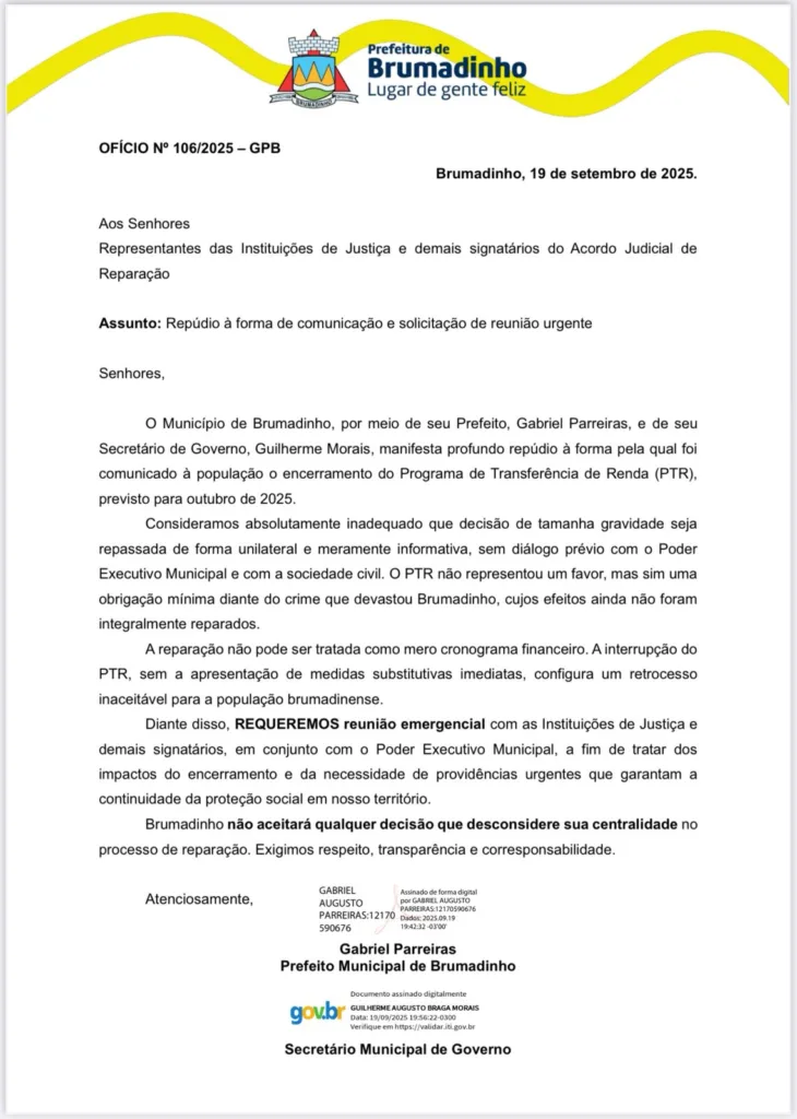 “O Município de Brumadinho, por meio de seu Prefeito, Gabriel Parreiras, e de seu Secretário de Governo, Guilherme Morais, manifesta profundo repúdio à forma pela qual foi comunicado à população o encerramento do Programa de Transferência de Renda (PTR), previsto para outubro de 2025”, diz a nota.