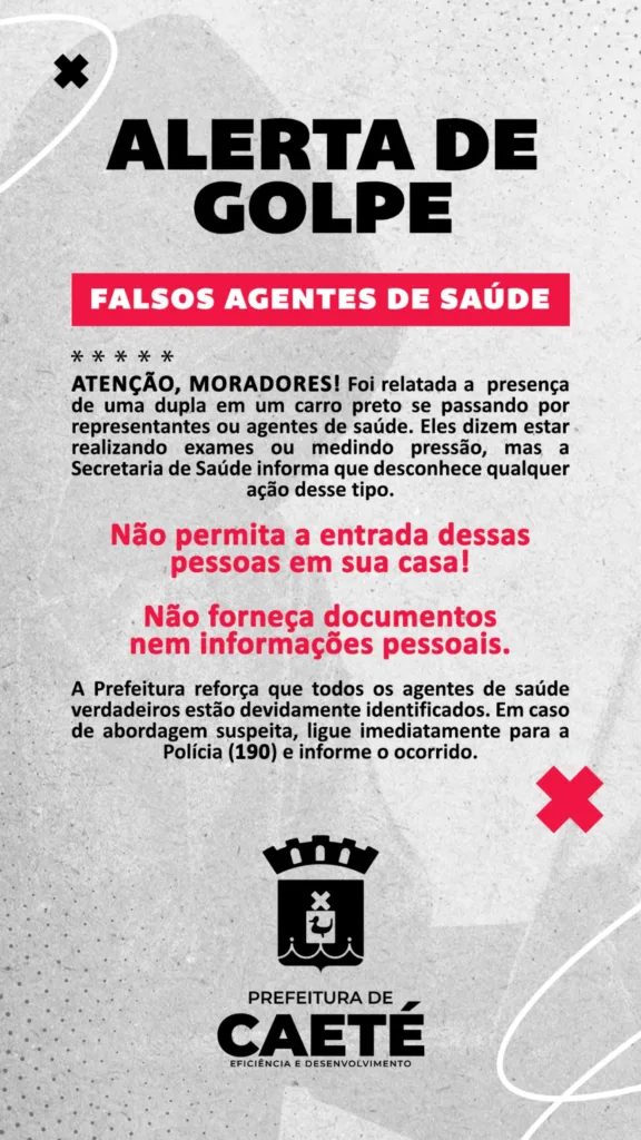 A Prefeitura reforça que todos os agentes de saúde verdadeiros estão devidamente identificados. Em caso de abordagem suspeita, a recomendação é ligar imediatamente para a Polícia (190) e informar o ocorrido.