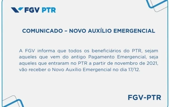 Conforme a FGV, “todos os beneficiários do PTR, sejam aqueles que vem do antigo Pagamento Emergencial, seja aqueles que entraram no PTR a partir de novembro de 2021, vão receber o Novo Auxílio Emergencial no dia 17/12”.