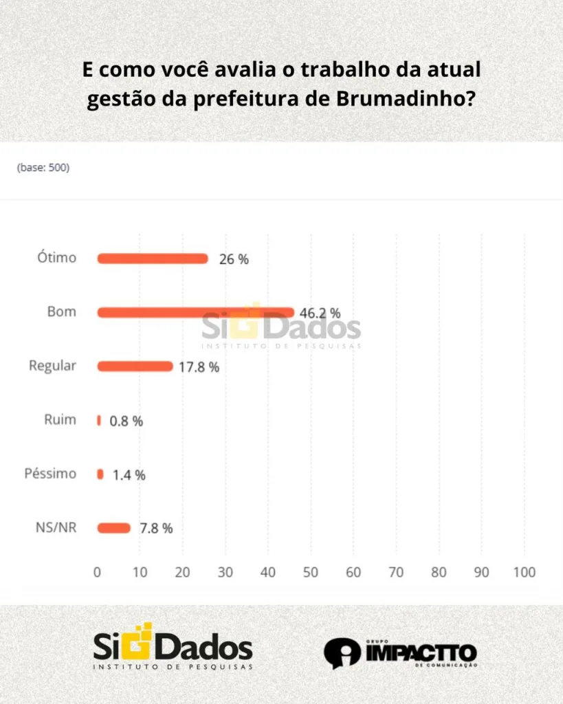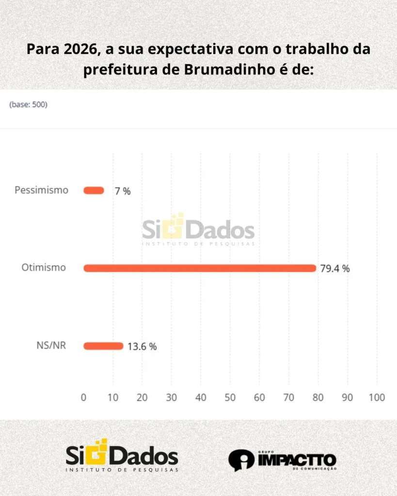 Satisfação e Otimismo. Essa é a opinião da população de Brumadinho sobre a atual gestão, segundo uma pesquisa realizada pelo Instituto de Pesquisas Sigdados, contratada pelo Grupo Impactto.