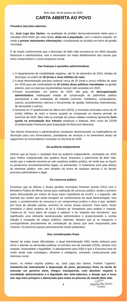 O prefeito de Belo Vale, José Lapa dos Santos, o Lapinha, publicou nesta terça-feira, 06 de janeiro, uma carta aberta à população admitindo crise financeira e uma dívida milionária da Prefeitura Municipal.