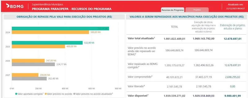 A primeira apresenta o total de recursos do programa, com informações sobre os valores já repassados ao BDMG e aqueles que ainda serão aportados pela Vale, conforme previsto no Acordo de Reparação.